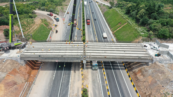 當天,杭金衢改擴建二期投入施工及道路保暢人員60余人、機械設備20多套、車輛30余臺,僅用8小時順利完成兩處互通A匝道橋江向單幅共14片T型梁板架設、防護兜底等工序。