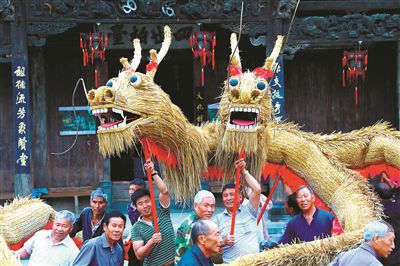 在汪家橋村,一卷歷經滄桑卻風采不減的明代圣旨真跡凝結了祖輩先烈的榮耀,每年農歷六月六在文化禮堂展出六分六秒,時刻提醒著后人崇學重教、見賢思齊;在三里外的赤川口村,兩條舞動了500余年的浙江省非物質文化遺產“汾口草龍”盤臥在禮堂內,每逢中秋等重要節日,便翻騰躍動盡顯蒼勁雄厚之美,寄托著全村村民祈盼風調雨順、興旺發達的美好愿望。