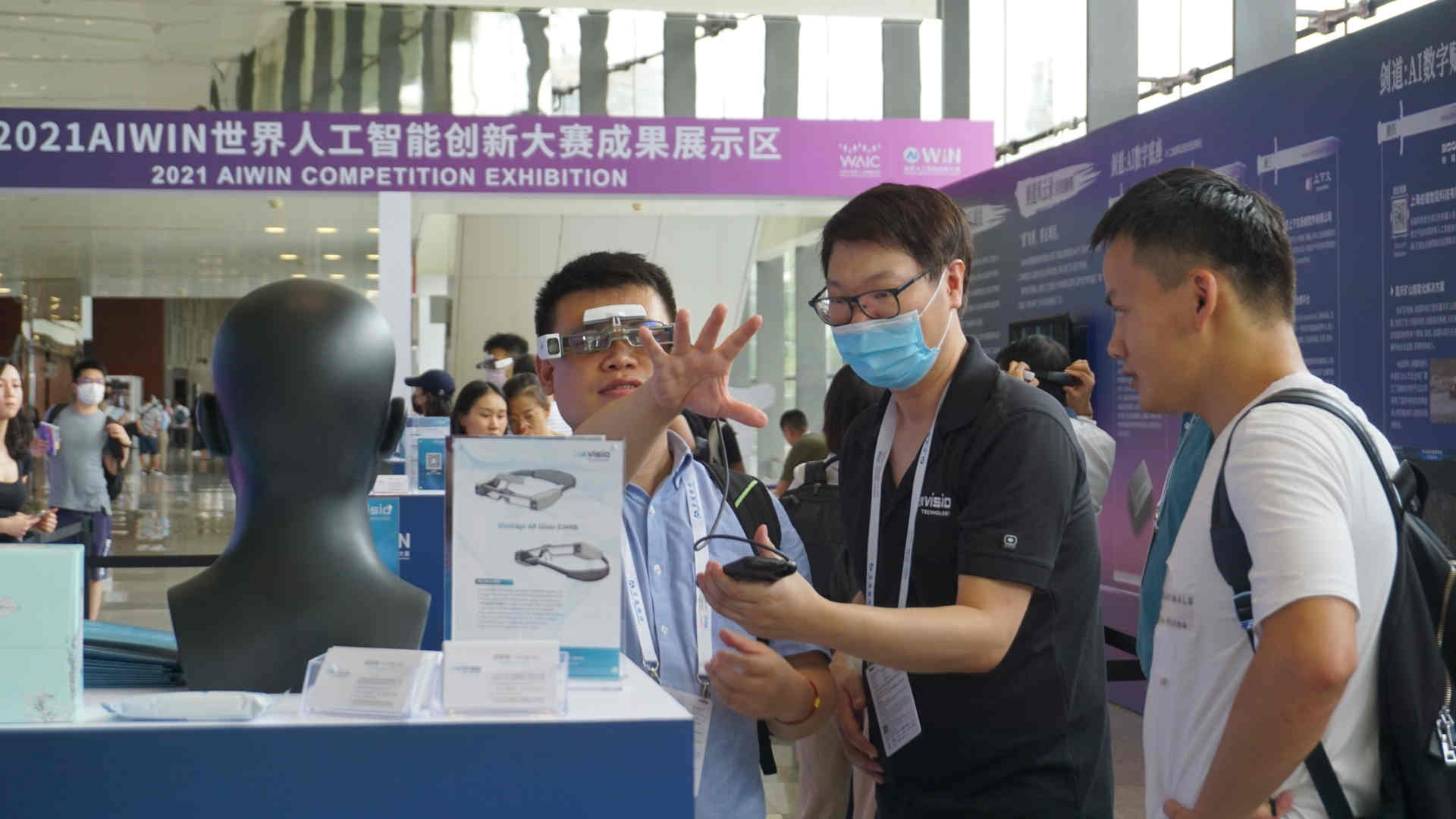 “這個禮盒被VSLAM技術錨定在真實空間的某個位置,從AR眼鏡看它就像真實存在的物體,遠離它就變小,走近它就變大,通過姿態、手勢及語音等方式可與之互動。這就是AR眼鏡的核心感知交互技術,其錨定能力是AR眼鏡可以供人們進行沉浸式體驗和虛與實交互的基礎!痹谑啦┲行腁IWIN展區中央的三個展示臺上,這款來自于詮視科技的AR眼鏡以輕量化AR眼鏡的方式,向觀眾呈現AIWIN賽事的前世今生。