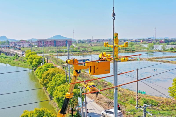 國網湖州供電公司帶電作業人員正在對配網設備開展不停電作業,在不影響用戶用電的同時,提升電網供電能力。姚羽霞攝
