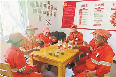 位于岳王路的杭州市職工服務中心“愛心驛家”,不僅是環衛工人的休息點,也是快遞員、公交司機、出租車司機的“加油站”。在這里,他們可以倒上一壺養生茶,吹吹空調,解除戶外作業的暑熱!叭硕嗟臅r候,我們一天要供應三四桶養生茶!笔新毠し⻊罩行墓ぷ魅藛T樂呵呵地表示,免費供應茶水的服務已經開展了兩年了,受到戶外工作者的一致好評。