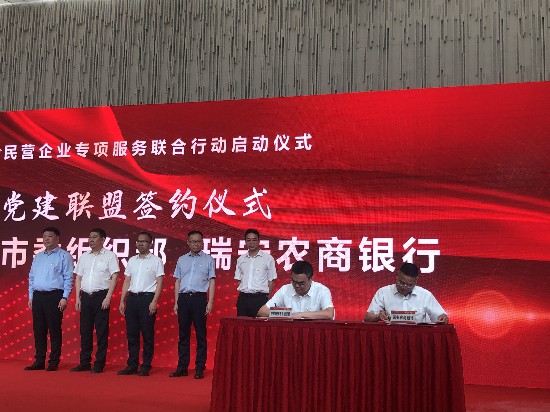 活動現場,瑞安農商銀行還與市委組織部、市經信局、市科技局、市市場監督管理局、市企業家協會分別簽訂黨建聯盟協議,向民營企業授信100億元,并向市興企融資擔保有限公司擔保授信3億元。