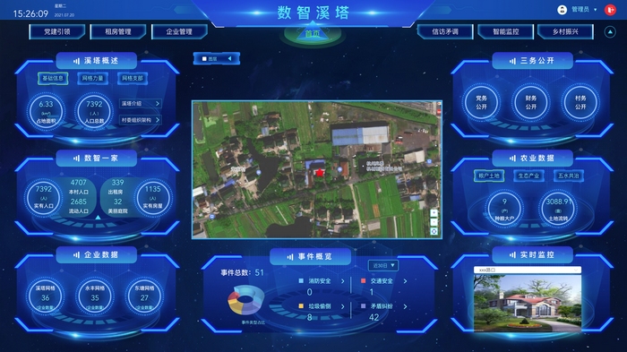 從溪塔村數智大屏上可以看到,一張村莊衛星云圖上共覆蓋六項內容,包括黨建引領、租房管理、企業管理、信訪矛調、智能監控、鄉村振興等。系統通過與不同平臺進行數據共享,“大腦”后臺計算,實現“一屏觀全村、一網管全村”。