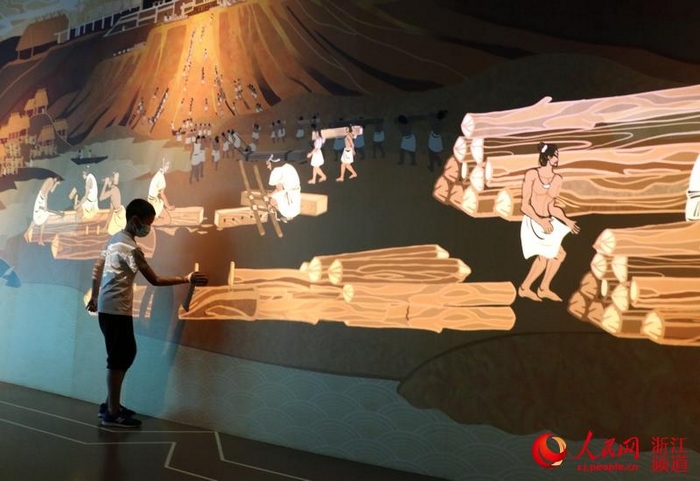 “意象良渚”跨媒體藝術沉浸展上,觀眾與藝術環幕互動。人民網 王麗瑋攝