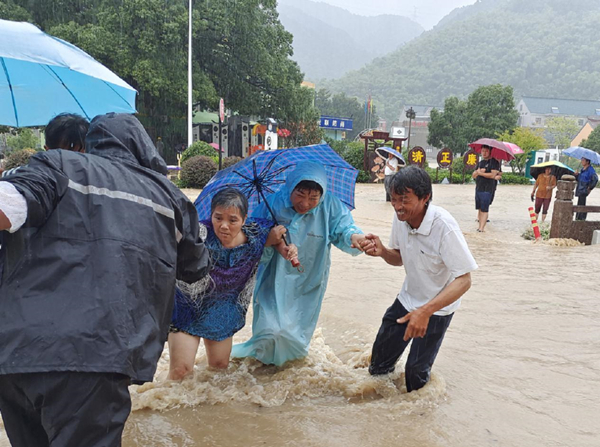 蕭山進化鎮的吉山村、華家墊村、東山村積水嚴重,部分居民區水位已淹過門檻,馬路邊的居民全部緊急撤離。