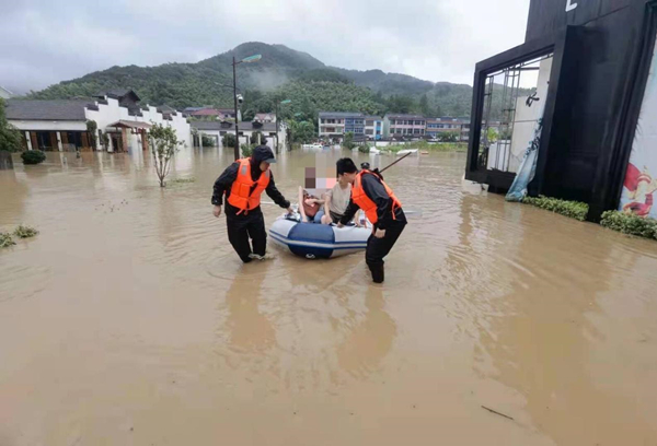 消防指戰員采取抱、背以及借助舟艇等方式緊急營救轉移被困人員。紹興市委宣傳部供圖
