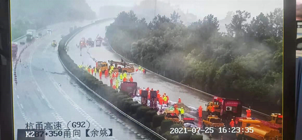 G92杭甬高速,287公里離大隱7公里附近,因江水漫灌積水較深,杭州方向封閉二三四車道及硬路肩,寧波方向封閉第一、二、三車道,杭州方向大隱、牟山進口關閉,寧波方向余姚進口關閉。浙江交警供圖