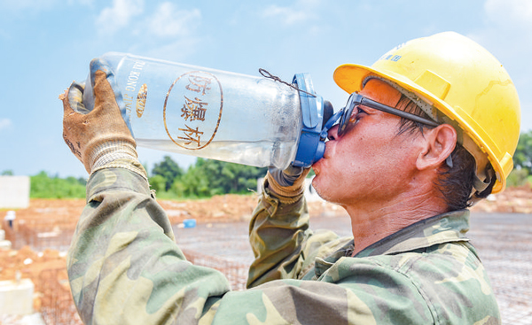 7月29日,在金華開發區湯溪鎮一重點項目施工現場,施工人員方紅偉正大口大口喝水解渴。臺風“煙花”一走,副熱帶高壓強勢回歸。目前,金華開發區多措并舉做好防暑降溫工作,在全力推進重點項目施工建設工作的同時,要求各參建單位妥善安排高溫期間施工生產工作。(李建林、夏中豪)
