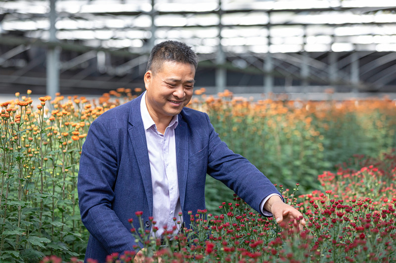 柴金甫在大棚里查看鮮花生長情況。嘉善縣委宣傳部供圖