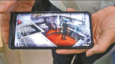 在手機上進行外賣餐飲店后廚實時播放。王嵐攝