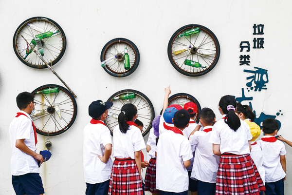 8月4日,金華市金義新區江東鎮六角塘村金華農村垃圾分類藝術館內,一批小學生在學習體驗垃圾分類“二次四分法”。2019年開放的金華市農村垃圾分類藝術館是全國首個以垃圾分類為主題的藝術展館。進入暑期以來,不少家長紛紛帶著孩子前來藝術館,學習體驗垃圾分類“二次四分法”,讓孩子們了解垃圾變廢為寶的全過程。(胡肖飛)