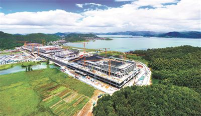 昨天(8月6日),無人機視角下,剛剛完成主體結構施工的寧波國際會議中心項目主會場已具雛形。目前該項目已開始機電安裝和裝飾裝修,預計年底基本建成。