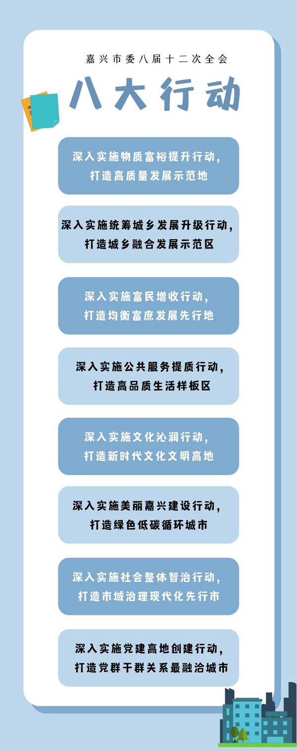 全會明確了嘉興要打造高質量發展建設共同富裕示范區的典范城市,強調未來五年嘉興要深入實施“八大行動”、全面推進“共富十改”,全方位、系統性推進共同富裕示范區的典范城市建設。