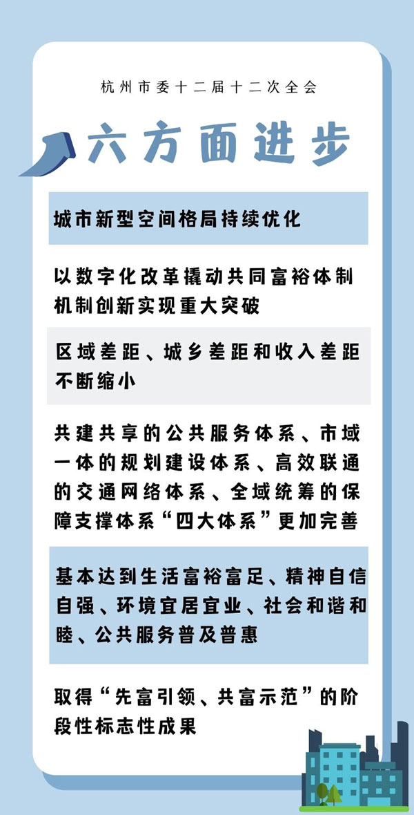 全會指出,到2025年,杭州將在六個方面取得進步: