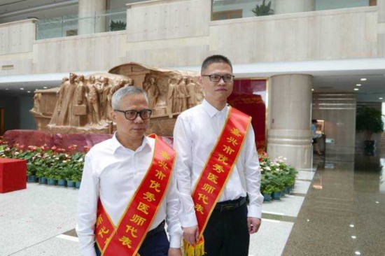 在8月17日嘉興市舉行的慶祝2021年中國醫師節活動現場,一群優秀醫師代表中間,一對父子吸引了在場所有人的眼球。