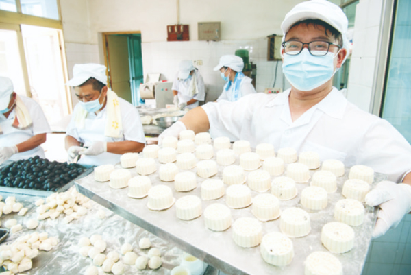 8月23日,在金華市區糖古糕點制作室里,員工趕制傳統手工婺式月餅。 傳統婺式月餅口味清淡,少糖少油符合現代人對健康飲食的追求。今年中秋節在9月21日,婺式月餅提前到7月初就開始制作,到中秋節前10天進入制作銷售高峰。(時寬兵)