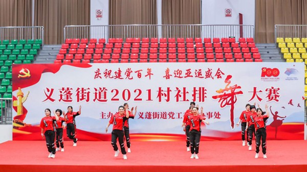 義盛村夕陽紅文化藝術團排舞隊參加街道排舞大賽。錢塘區社會發展局供圖