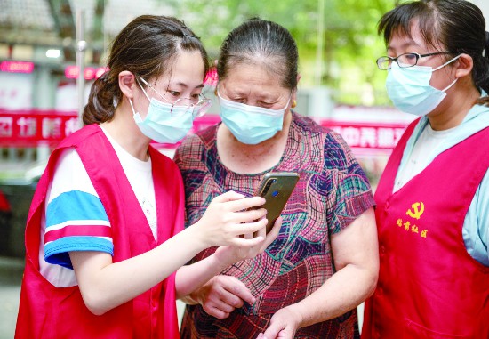 8月24日,在金華婺城區城北街道站前社區,黨員志愿者教老年居民如何用智能手機查詢和出示健康碼、行程卡。黨員志愿者說,按照疫情防控要求,進入醫院、酒店、超市、農貿市場等公共場所,需要出示健康碼、行程卡,教老年人使用智能手機,可以給他們的日常生活帶來便利。(時寬兵)