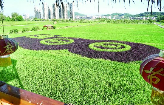8月30日,空中俯瞰金華義烏市赤岸鎮雙喬彩稻公園,綠、黃、紫、藍、白五色水稻繪制的稻田畫氣勢恢弘。赤岸鎮喬亭村種糧大戶馮向偉用彩色水稻繪制黨旗、天安門等圖案及不忘初心、牢記使命等字樣,打造了一道亮麗的田園風景。(張建成、李云升)