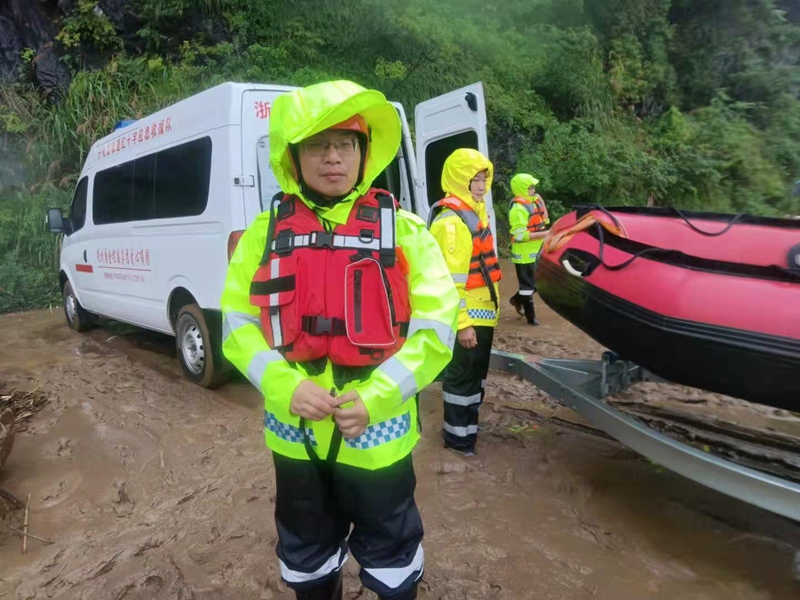 2021年6月30日,狄韋龍在開化縣城關鎮密賽村參與抗洪救援。開化傳媒集團供圖