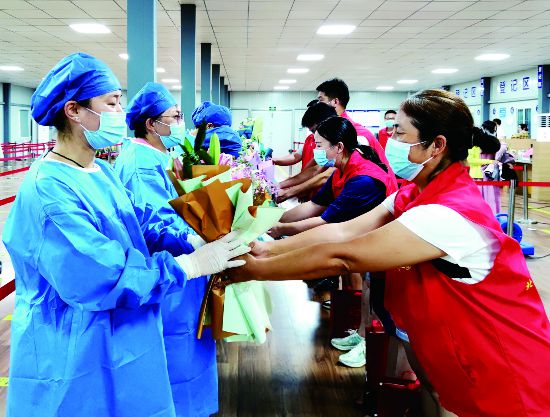 連日來,浙江義烏北苑街道四季社區黨委組織社區黨員志愿者、紅領青年,慰問奮戰在一線的醫務工作者。在北苑街道隔離點賓館以及方艙接種醫院,黨員志愿者、紅領青年向醫務工作者送上鮮花和慰問品,感謝他們堅守初心、擔當使命,始終把人民群眾生命安全和身體健康放在第一位,統籌做好疫情防控、醫療救治等各項工作,為居民提供優質、高效、便捷的衛生健康服務。(王志堅)