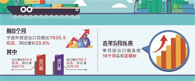 寧波海關近日發布數據顯示,今年前8個月,寧波外貿進出口總額達7635.5億元,同比增長23.6%。其中,出口額4872.8億元,同比增長20.7%;進口額2762.7億元,同比增長29.2%。