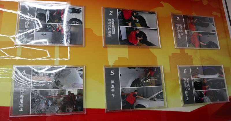 店里的墻上張貼了洗車步驟,每個步驟的講解都是孩子們洗車時的照片,便于孩子們回憶。人民網 張帆攝