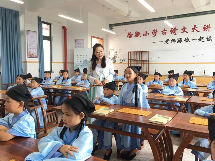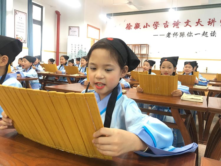 “小書童”們身著漢服,頭戴帽子,端坐桌前,書桌上放著《論語》與書簡;徐凝小學語文特級教師種麗也身著漢服,手拿教尺,站在學生中間。師生共同誦讀、吟唱《周南·桃夭》。