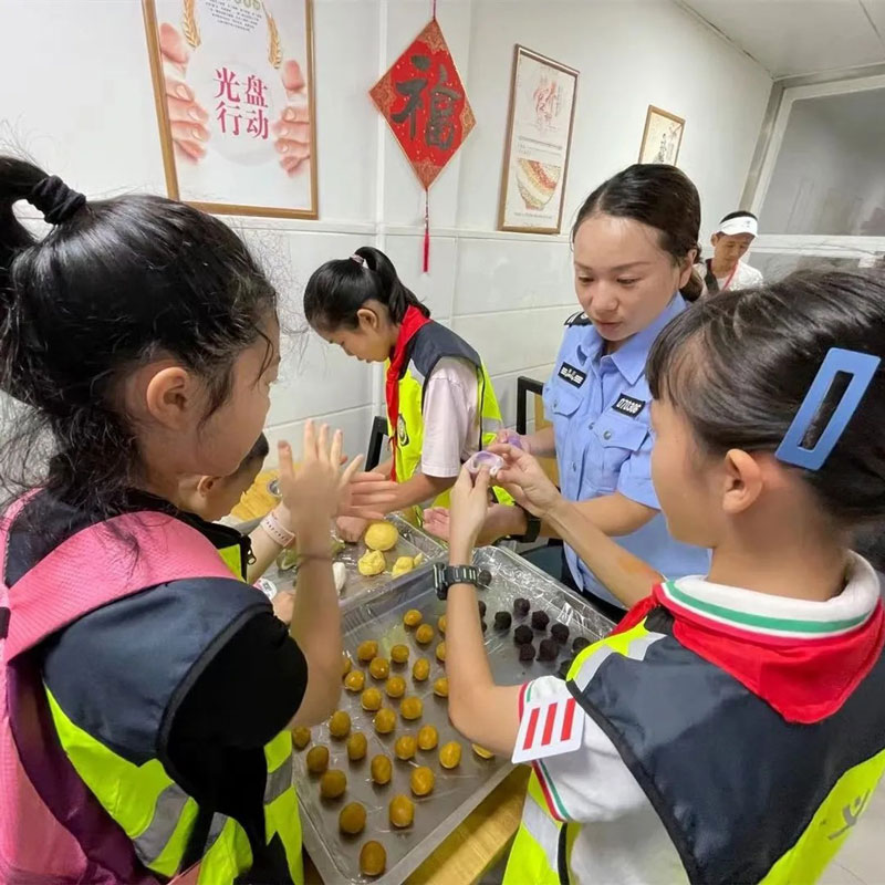 “警察叔叔阿姨,你們是在做月餅嗎?我也要來幫忙!”大家正做得熱火朝天,突然又來了一群小朋友,他們是來參加志愿活動的西子小義警,剛才在杭州西湖斷橋協助民警們為游客指路、維護秩序。大家手把手熱情地教小義警做月餅,食堂里歡笑聲久久回蕩。大家將團圓月餅裝入盒子,盒子上貼上了派出所“小岳反詐答人”小程序的二維碼,助力反詐宣傳。為了守護好居民游客的錢袋子,景區分局不斷創新公交站牌、社會面廣告、入住用餐提醒等多種形式,持續掀起反詐熱潮。