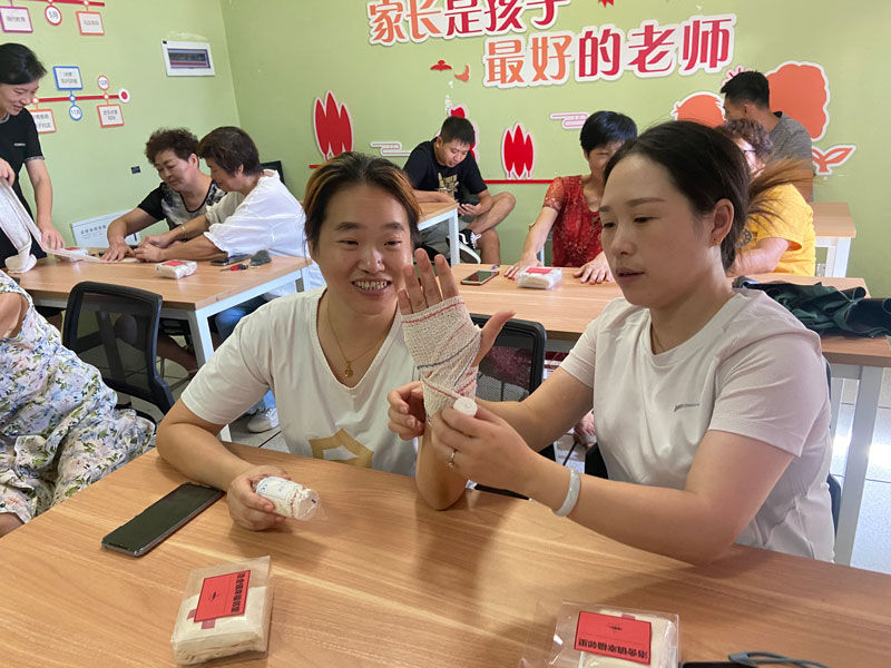 為了使學員們更熟練地學會創傷救護處理技能,社工進行現場演練,讓學員們用直接壓迫止血法進行手部、腿部、頭部等位置的包扎。