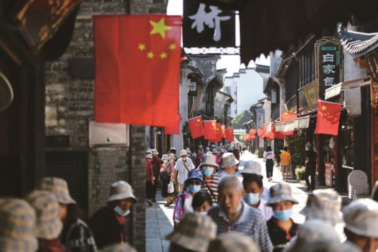 9月27日,嘉興市區月河歷史街區的商戶掛出了國旗,營造出歡度國慶的濃厚氛圍。這幾天,許多以老年人為主的旅游團在國慶長假之前來這里游玩,既避開了旅游高峰,又提前感受到了國慶的喜慶氣氛。(王振宇)
