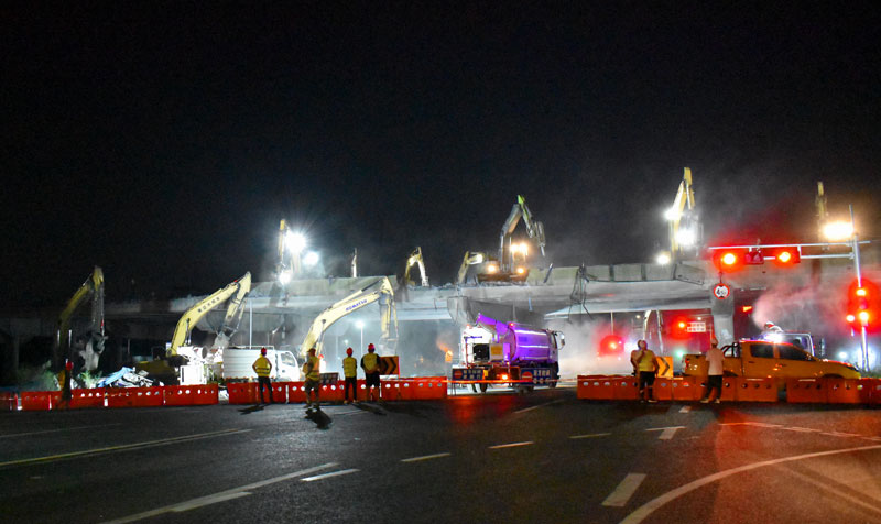 為確保黨農線跨線橋拆除作業順利,參建各方不斷探索精細化施工,并逐一破解難題:實地勘查,精密推演,結合現場檢測勘查情況編制拆除施工方案,并開展多次集體討論、模擬推演,有效降低施工風險,提升施工效率;多方聯動,精細協作,與有關部門充分對接協調,形成精細完善的交通組織方案,并在施工現場及重點路口安排青年突擊隊協助交警進行安全監控及勸導指揮,有力保障施工路段通行秩序;統籌協調,精準管控,建立“橫向到邊、縱向到底、控制有效”的現場管理體系,并對施工旁站人員開展培訓、交底,從而精準管理協調現場裝載機、鎬頭機、挖掘機等數十臺機械設備,確保拆除施工有序可控,現場安全高效。