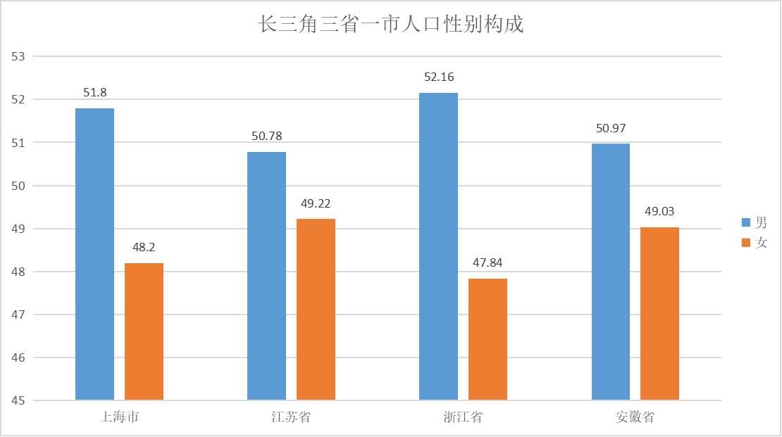 從性別構成上看,上海市常住人口中,男性人口為12875211人,占51.8%;女性人口為11995684人,占48.2%?側丝谛詣e比(以女性為100,男性對女性的比例)為107.33。