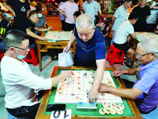 9月28日晚,金華義烏北苑街道望道社區第一屆“友好杯”街頭象棋大賽在何麻車居民區開賽,來自多個省份的24名外來建設者同場賽棋藝!按蠹叶际菒酆孟笃宓耐鈦斫ㄔO者,經常圍在一起下象棋。每到夜晚,這里總是‘楚河漢界起硝煙,棋逢對手戰猶酣’!币恢痹诒荣惉F場忙個不停的“義烏好人”老丁說,他有一個微心愿,為豐富轄區外來建設者的業余生活辦一場象棋大賽。此次,由北苑街道團委、望道社區黨委聯合舉辦的街頭象棋大賽,可以說是圓了他的微心愿。(王志堅)
