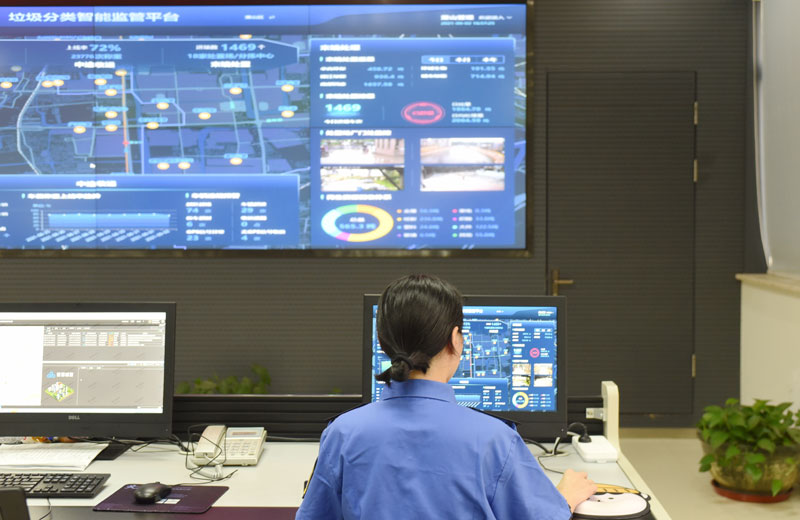 工作人員正在讀取垃圾分類智能監管平臺數據。陳袁帆攝