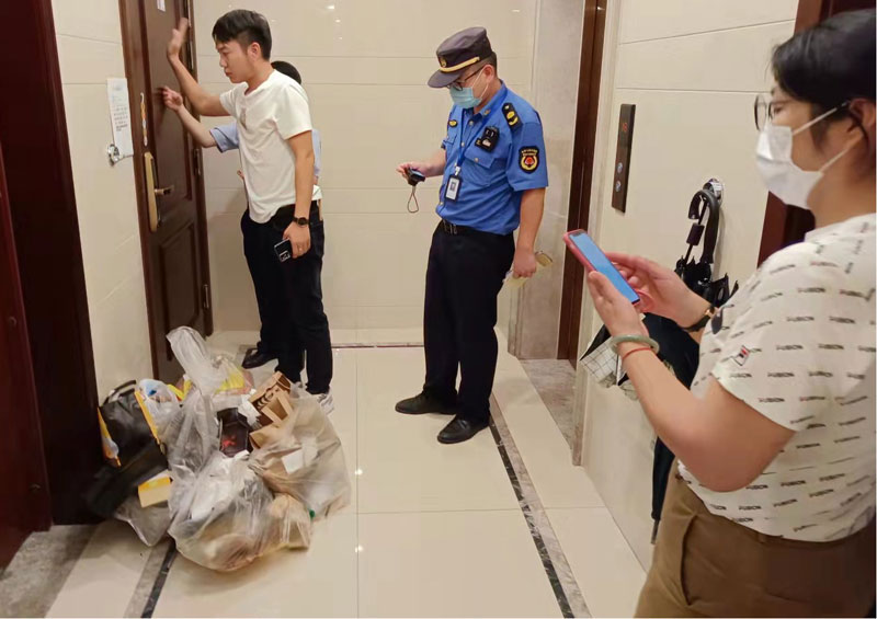 隨后,檢查組人員來到該住戶家門口,發現門口也堆積著一定數量的垃圾。物業人員表示,該住戶是一名網絡主播,一直深居簡出,社區和物業工作人員多次上門勸導其參與垃圾分類未果。