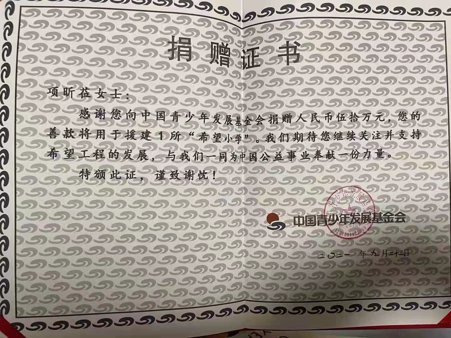“項昕蒞女士,感謝您向中國青少年發展基金會捐贈人民幣五十萬元,您的善款將用于援建1所‘希望小學’……”近日,杭州桐廬姑娘項昕蒞收到了來自中國少年發展基金會送來的捐贈證書,對她的慷慨之舉表達了謝意,并告知款項用途。