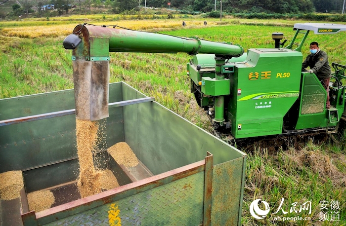 大柳鎮華嚴庵村,農戶把收割后的富硒水稻裝車。人民網 周坤攝
