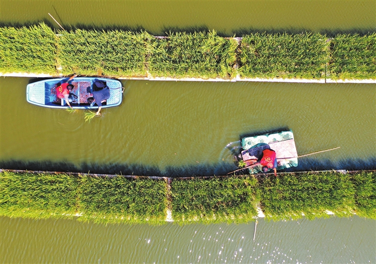 湖州市長興縣和平鎮東山村黨員志愿者日前在“稻魚”共養幫扶基地查看水稻長勢。今年初以來,該村利用良好水資源,發展“稻魚”共養產業,提升水環境,幫助低收入農戶增收致富。(許旭)
