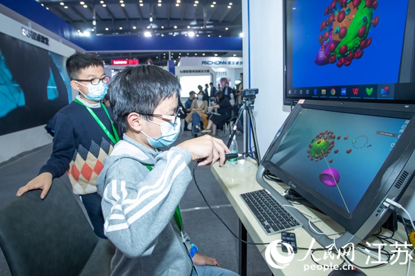 在物聯網應用和產品展覽展示現場,小朋友體驗VR+AR探究式互動學習體驗系統。胡瀟攝