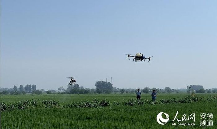 白露前后,在明光市戴巷村,種糧大戶正忙著無人機植保作業。人民網 汪瑞華攝