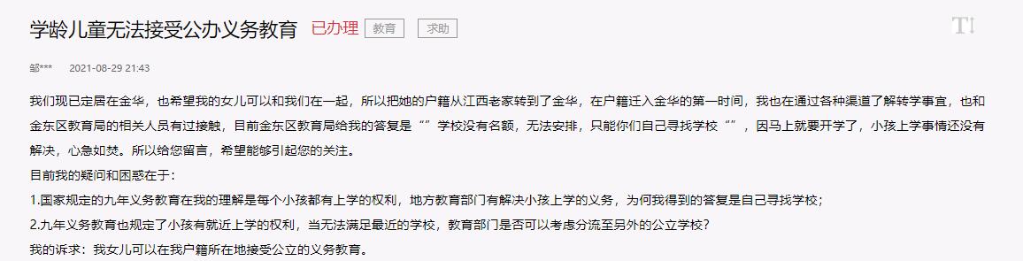 教育無小事,教育是家長們最關心的問題之一。前段時間,浙江金華一位網友在人民網“領導留言板”上反映了“學齡兒童無法接受公辦義務教育”問題。