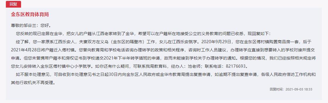 “經了解,您一家原系江西樂安人,夫妻雙方在義烏(金東區的隔壁市)工作,女兒在江西樂安就學。2020年9月29日,您在金東區傅村鎮購置商品房一套,后于2021年4月28日將戶籍遷入傅村鎮。您曾向教育局和學校電話咨詢辦理轉學的政策和相關程序,咨詢時工作人員建議,辦理轉學應直接到想要轉入的學校對接并提交申請。但您未曾攜帶戶籍本和房權證書到學校遞交2021年下半年轉學插班的申請,故而未能接到學校關于辦理轉學的通知!苯饢|區教育體育局工作人員表示,根據該網友的實際情況,工作人員已經按照相關規定將該網友的女兒安排轉入金東區傅村鎮中心小學就學。
