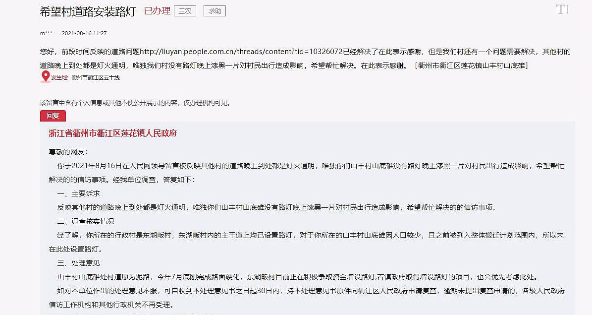 首次留言時隔兩個月,在今年8月16日,該位網民再次留言表示,前段時間反映的道路問題已經解決,“但是我們村還有一個問題需要解決,其他村的道路晚上到處都是燈火通明,唯獨我們村沒有路燈晚上漆黑一片對村民出行造成影響,希望幫忙解決!
