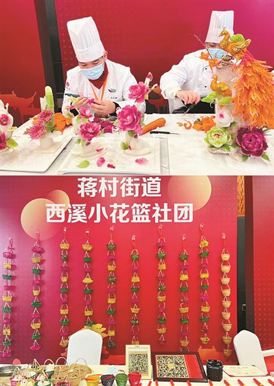 啟動儀式現場,西湖區雙浦鎮剪紙社團、西湖職高的果蔬雕刻社團、蔣村街道的西溪小花籃社團等也作為優秀項目參展。西湖區轉塘街道茶藝社團通過茶藝培訓傳播茶飲健康理念,被杭州市2021亞運會確立為人文體驗點;西湖區西溪小花籃社團將現代數字技術與傳統竹編工藝相結合,制作出的竹編“健康碼”“微信碼”,既環保又實用。