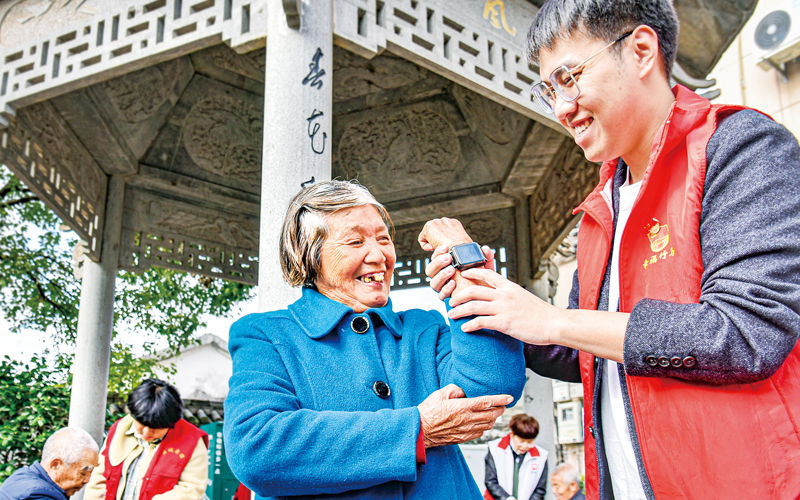 “這個手環好,不僅能看時間、天氣,還能量血壓、測心率,還能一鍵呼叫!11月24日,金華婺城區竹馬鄉下張家村村民陳彩云抬起手腕,向記者展示新發到手的康養手環。
