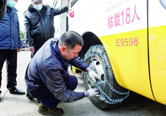 日前,在金華市區公交南站,公交修理工與駕駛員舉行了一次公交車裝拆防滑鏈條比武。車隊長徐國鋒說,車隊還將陸續開展以防凍、防雪、防霧、防雨、防滑、防事故為主要內容的培訓練兵活動,以提高駕駛員的應急防范能力。據了解,隨著氣溫的下降,公交冬運保障拉開帷幕。金華市公交集團已經開始冬運物資的儲備和冬季行車安全教育培訓,為1000多輛公交車都配備了足量的防滑鏈條、融雪劑等物資。(李建林)