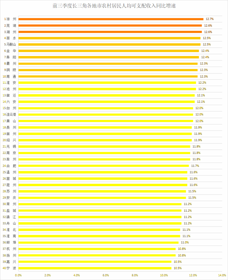 前三季度長三角各地市農村居民人均可支配收入同比增速排名中,徐州、蕪湖、湖州位列前三甲。今年前三季度,徐州農村居民人均可支配收入同比增長12.7%,這得益于近年來徐州在農業農村建設方面取得的長足進步;蕪湖和湖州農村居民人均可支配收入同比增長則達到12.6%。