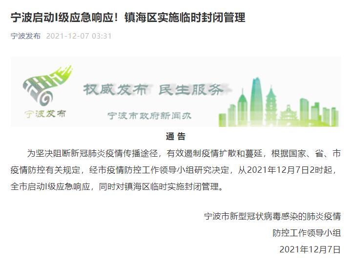 為堅決阻斷新冠肺炎疫情傳播途徑,有效遏制疫情擴散和蔓延,根據國家、省、市疫情防控有關規定,經寧波市疫情防控工作領導小組研究決定,今天2時起,寧波全市啟動I級應急響應,同時對鎮海區臨時實施封閉管理。