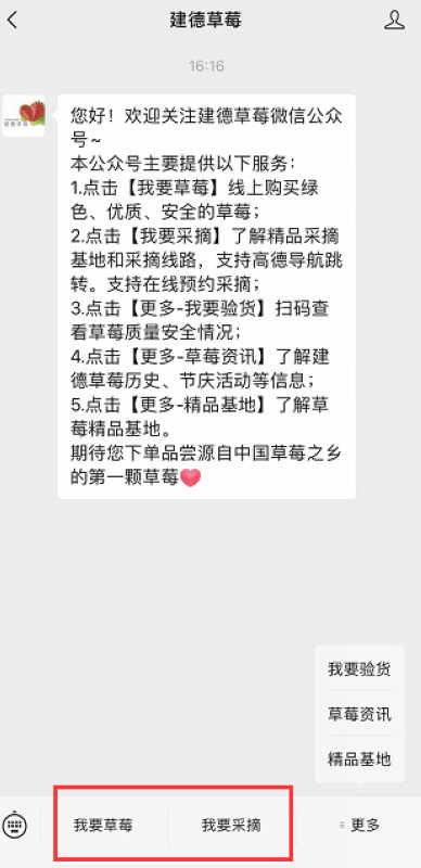 “建德草莓”公眾號上的草莓預售和采摘預約入口截圖